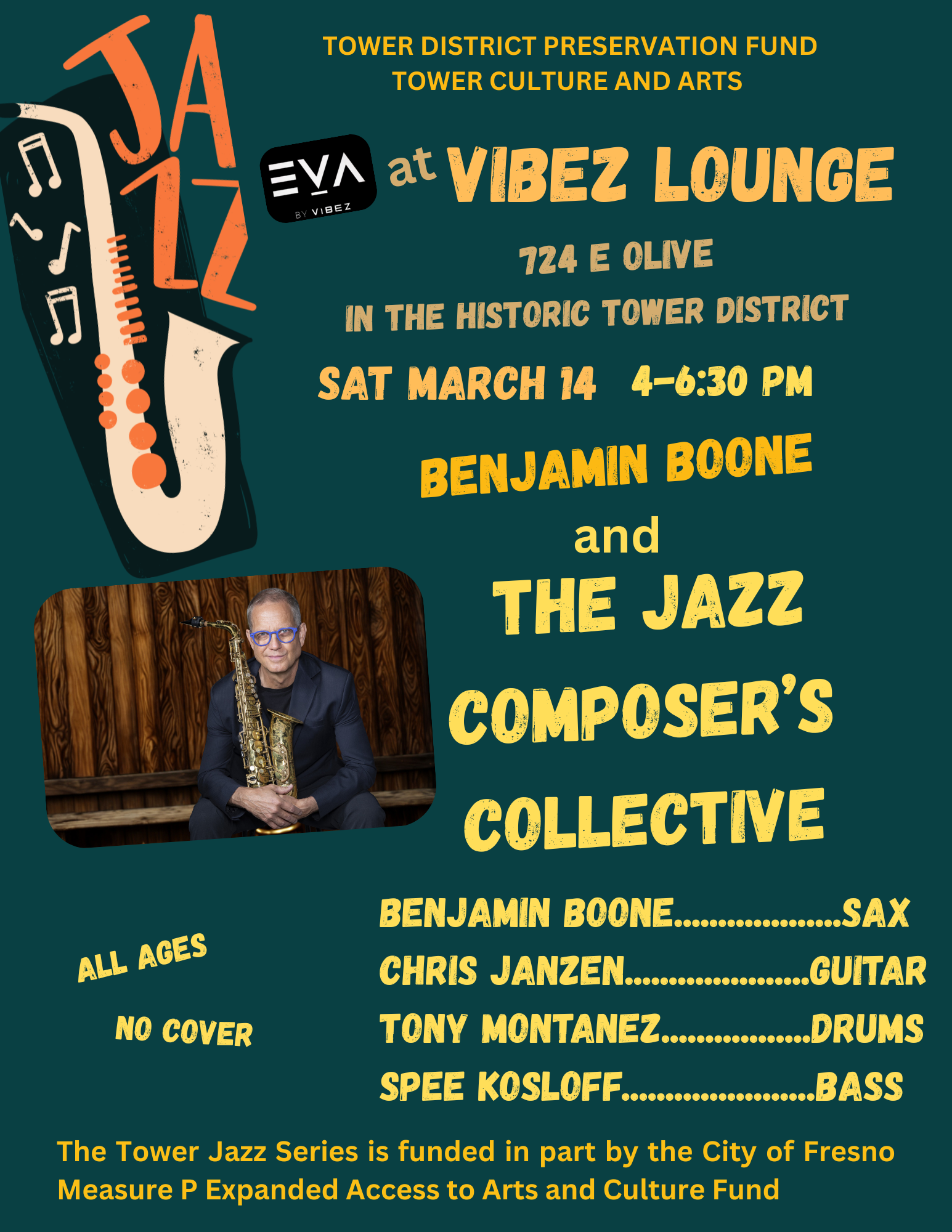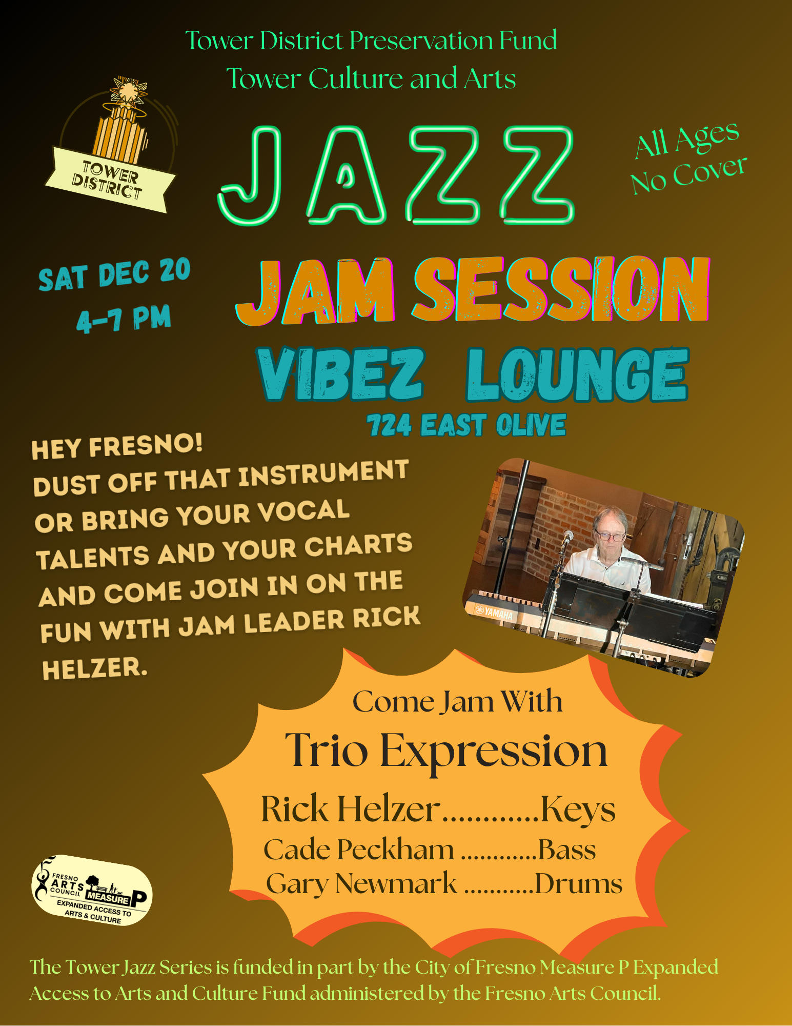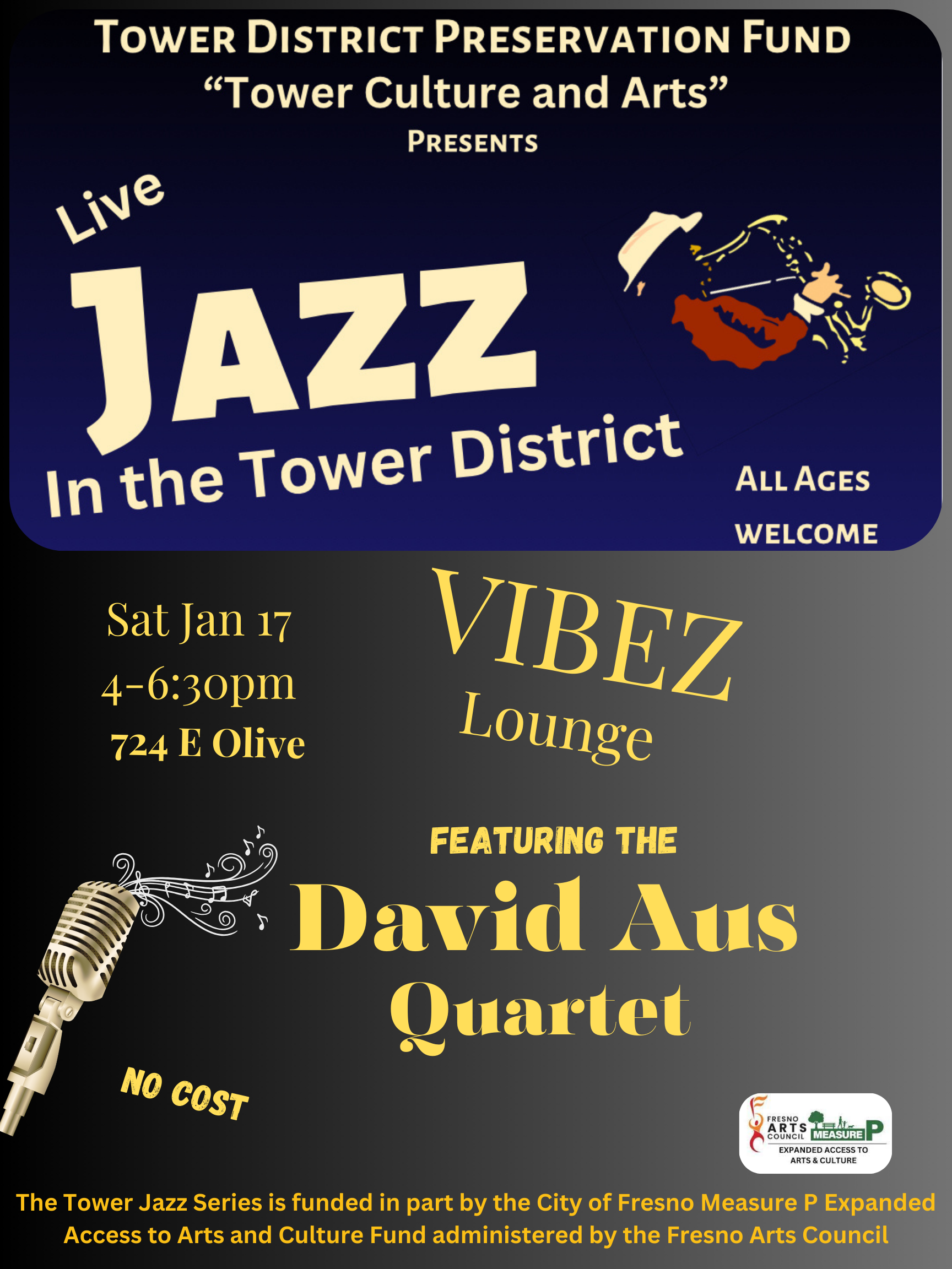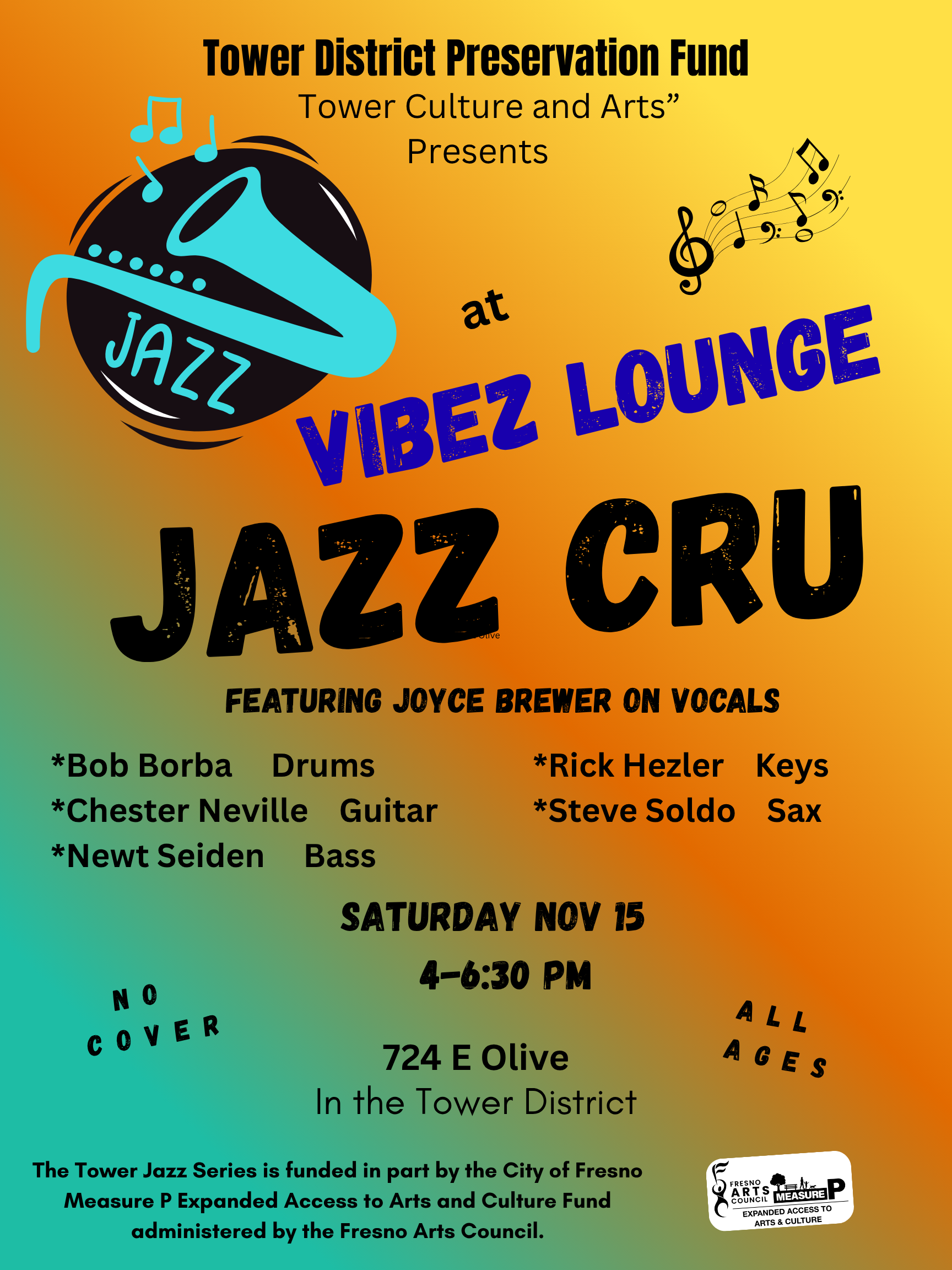 The Tower District Preservation Fund is happy to announce that we have received a 2025-26 Expanded Access to Arts and Culture Grant, funded by Measure P and administered by the Fresno Arts Council. This grant allows our organization to fund a monthly jazz series in the Tower District hosted by Vibez Lounge. Many thanks to the Fresno Arts Council, the City of Fresno, California, and to all of you, the citizens of Fresno, for your support of Measure P.